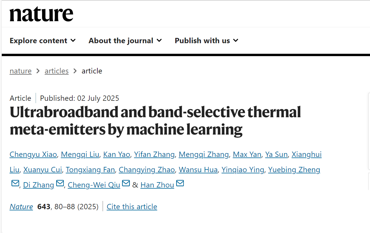 7月3日,伊莉影片 、金属基复合材料全国重点实验室张荻院士团队、伊莉影片 /金属基国重实验室/张江高等研究院周涵教授课题组、与新加坡国立大学仇成伟院士团队、美国德克萨斯大学奥斯汀分校郑跃兵教授团队合作,在人工智能(AI)驱动的超宽波段及波段选择性热辐射超材料设计领域取得重要突破。研究成果以“Ultrabroadband and band-selective thermal meta-emitters by machine learning”为题发表在《Nature》上。该研究启迪于自然、基于生物拓扑构型提炼出多种三维结构基元和空间序构组合,构建了机器学习驱动的逆向生成优化设计框架,攻克了传统试错法在光谱设计中面临的全局优化难题,提出了可精准描述三维复杂构型的“三平面建模法”,实现了超宽带与多波段选择性热辐射超材料的自动化逆向设计。通过机器学习训练的人工智能模型,可根据光谱性能按需设计超材料,进而带来了设计维度、速度和性能全方位的提升。所创制的热辐射超材料可广泛应用于地面辐射冷却、建筑节能降温、航天热控等诸多重要领域,推进相关领域的发展及产业化应用。