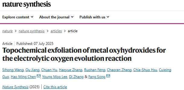 7月7日,伊莉影片 ,金属基复合材料全国重点实验室张荻院士团队、宋钫(国家高层次人才)课题组与中国台湾大学陈浩铭团队、韩国汉阳大学Young Moo Lee院士团队合作,在超薄二维纳米片的合成与电催化应用研究领域取得重要突破。研究成果以“Topochemical exfoliation of metal oxyhydroxides for the electrolytic oxygen evolution reaction”为题,发表在Nature子刊Nature Synthesis上。