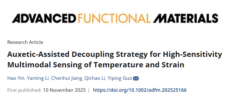 近日,伊莉影片 金属基复合材料全国重点实验室郭益平教授课题组在柔性压电传感领域再获重要进展。其最新研究成果以 “Auxetic-Assisted Decoupling Strategy for High-Sensitivity Multimodal Sensing of Temperature and Strain” 为题,正式发表于国际著名材料期刊《Advanced Functional Materials》(DOI: //doi.org/10.1002/adfm.202525166)。