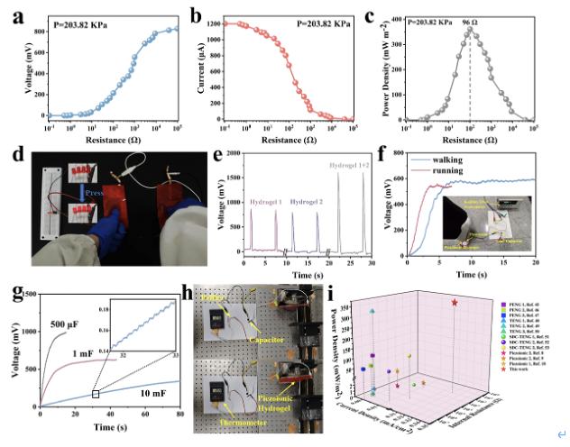图4. 离子压电水凝胶发电机的能量收集性能。a–c) 输出电压、电流和功率密度随外部负载电阻的变化关系。d) 两个水凝胶发电机串联为四个小型红色LED供电的照片。e) 两个串联水凝胶发电机的电压输出曲线。f) 水凝胶发电机从人体步行和跑步中收集机械能快速充电1 mF电容器的电压曲线。g) 由串联水凝胶发电机供电的500 μF、1和10 mF电容器的充电曲线。h) 水凝胶发电机充电1 F电容器以驱动帕尔贴制冷的系统数码照片。i) 离子压电水凝胶发电机与其他先进机械能量收集器(如PENG、TENG、和SDC-TENG)在内阻、电流密度和功率密度方面的对比。