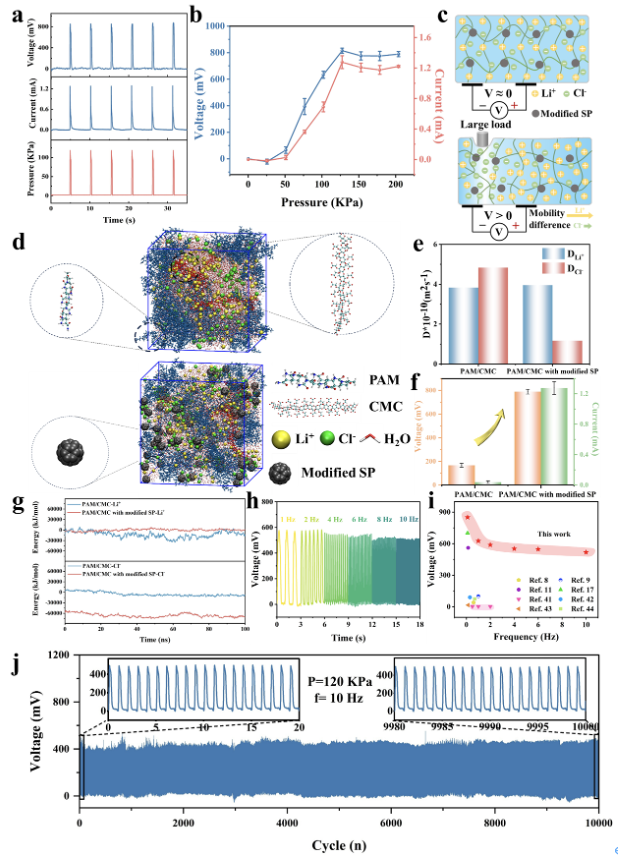 图1. 水凝胶发电性能与离子压电机制研究。a) 离子压电水凝胶最大短路电流、最大开路电压和外加压力变化曲线。b) 不同外加压力下水凝胶的电压和电流输出特性。c) 离子压电水凝胶中静电电位和离子传输示意图。d) PAC修饰SP水凝胶与未修饰SP水凝胶的分子动力学MD模拟模型。e) Li⁺和Cl⁻的模拟离子扩散系数。f) PAC修饰SP与未修饰SP水凝胶的实际电压和电流输出对比。g) Li⁺、Cl⁻与水凝胶基质之间的模拟基质相互作用能。h) 水凝胶在1–10 Hz频率范围内的电压输出。i) PAC修饰SP水凝胶与其他已报道压离子水凝胶的频率响应对比。 j) 在120 kPa载荷和10 Hz频率下经过10,000次压缩循环的电压输出稳定性。