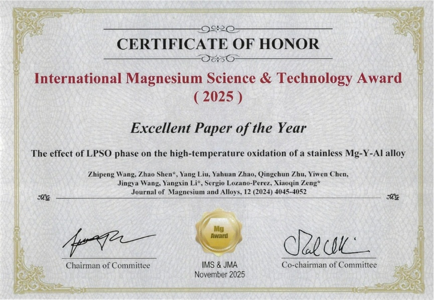 曾小勤教授团队沈朝副教授指导的论文“The effect of LPSO phase on the high-temperature oxidation of a stainless Mg-Y-Al alloy”荣获年度优秀学术论文奖(Excellent Paper of the Year)。研究揭示了Mg-11Y-1Al合金在500C下具备优异抗氧化性能的关键原因:网络状LPSO相在高温下会转变为针状结构,并在氧化前沿优先形成致密氧化物网络,从而加速构建连续、稳定的Y₂O₃保护膜。这一由微结构演化驱动的强化型氧化膜大幅降低了氧化速率,使合金在长时间暴露后仍保持良好完整性。研究最终形成了“结构转变促进膜层快速致密化”的新机制,为稀土镁合金的高温防护设计提供了新的思路。