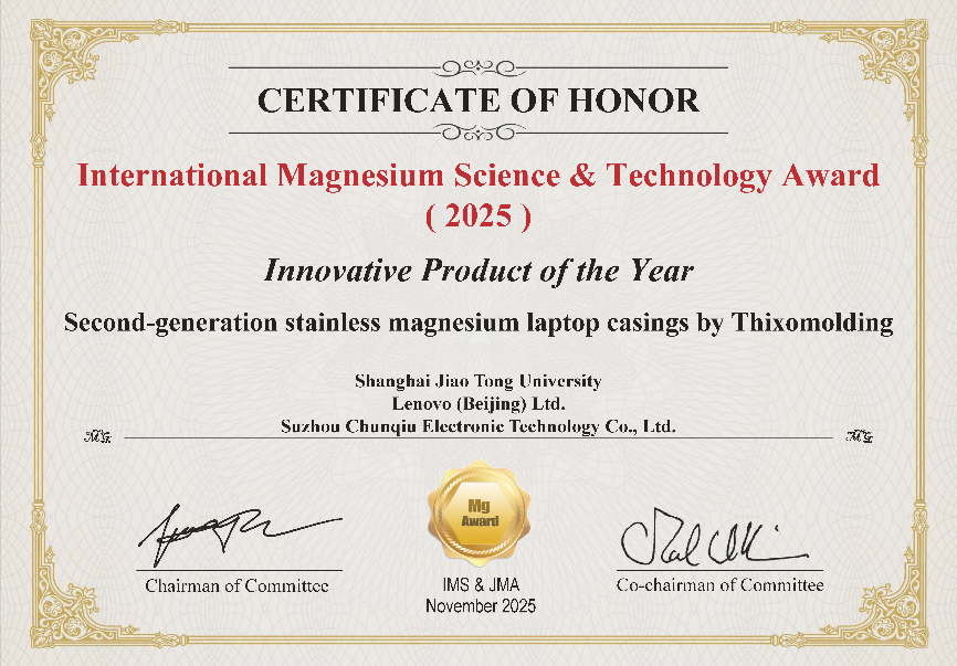 曾小勤教授团队牵头申报的“Second-generation stainless magnesium laptop casings by Thixomolding”荣获年度创新产品奖(Innovative Product of the Year)。曾小勤教授团队与联想集团开展产学研合作,成功推动了不锈镁合金在消费电子领域的应用。继第一代变形镁合金成功应用于型号Thinkbook X IMH,摘得国际镁协(IMA)2024年度最佳变形产品奖,本年度推出的YogaBook 9i,采用了半固态注射成型工艺,制造成本降低50%以上,是团队在新材料制造领域的又一大突破。