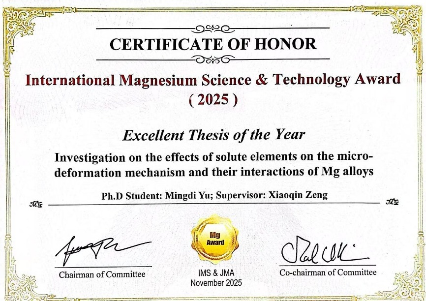 曾小勤教授指导的博士生于铭迪的学位论文“Investigation on the effects of solute elements on the micro-deformation mechanism and their interactions of Mg alloys”获得年度优秀学位论文(Excellent Thesis of the Year)。该博士学位论文结合微纳力学测试与第一性原理计算,系统研究了溶质元素对镁合金中位错滑移及孪晶行为的影响,提出了镁合金多系滑移的调控机制,揭示了镁合金中位错相互作用对塑性变形及应变硬化的影响规律,相关研究成果在Acta Materialia,International Journal of Plasticity等国际顶级学术期刊发表,为高塑性镁合金的设计提供了重要理论依据。