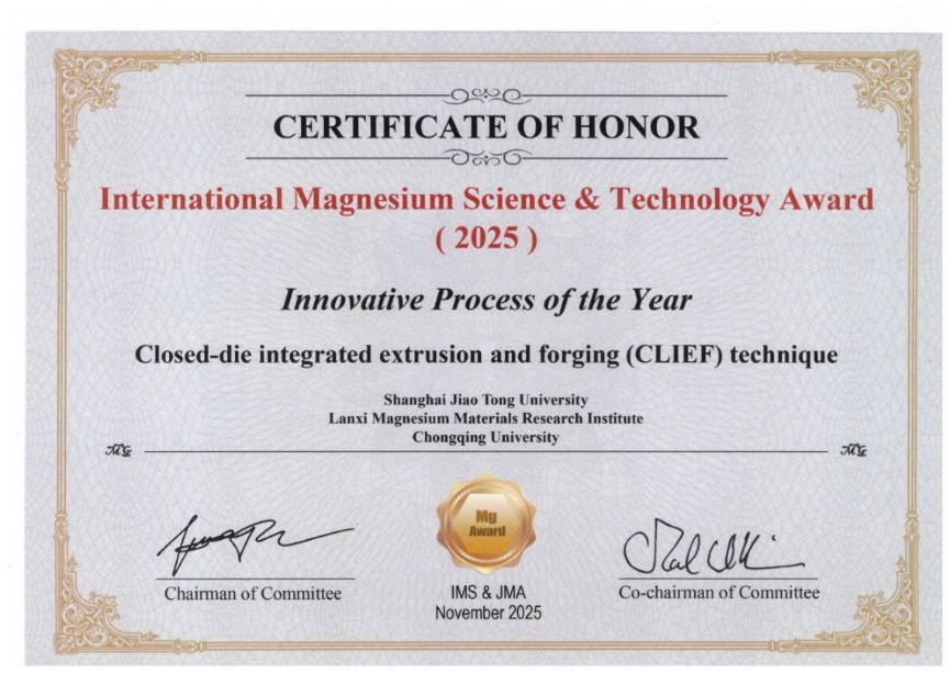董杰教授团队王锋华副研究员、曾健助理研究员牵头申报的“Closed-die integrated extrusion and forging (CLIEF) technique”荣获年度创新工艺奖(Innovative Process of the Year)。团队历经多年,开发出挤锻复合成形技术,解决了第一代和第二代高强镁合金复杂构件组织均匀性差的难题,制备出了力学性能稳定的大规格镁合金构件,目前已应用于多个国家重点型号以及重型卡车上。