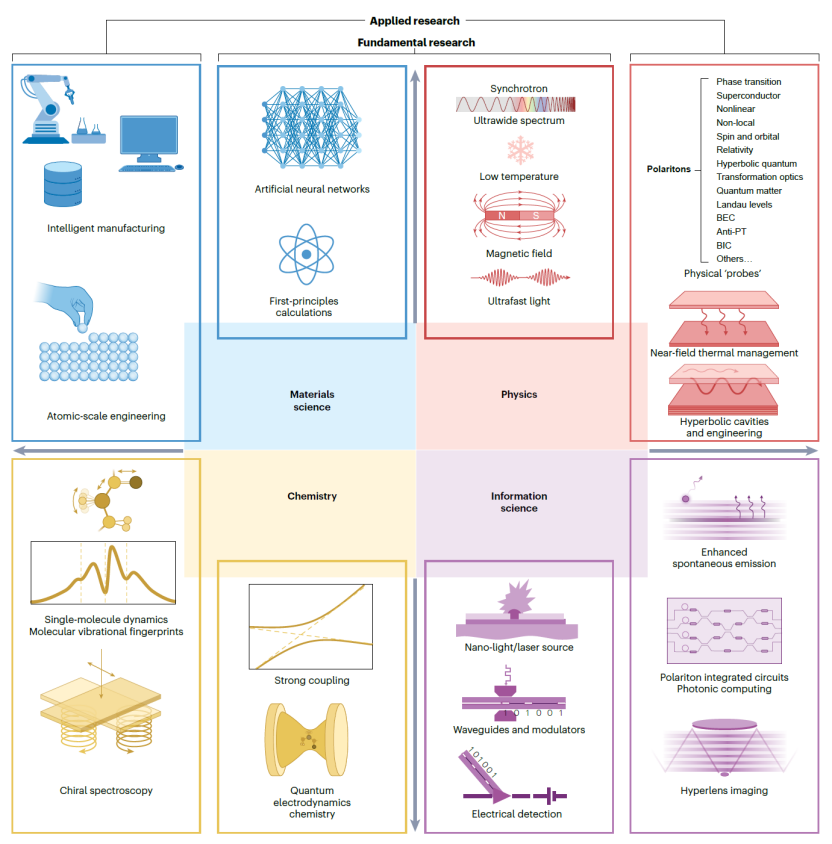 图示系统描绘了该领域从基础科学突破走向前沿技术转化的宏大路线:以材料科学中的“原子制造光学态”与能带工程为起点,结合物理学中的极度局域波动力学与量子态探针;进一步延伸至化学领域,实现从单纳米尺度分子指纹感知到“用光创制分子”的范式跨越;在信息科学中,落地于片上光源集成、超高速调制与极化激元计算器件,展现其赋能全光算力硬件底座的颠覆性潜力。